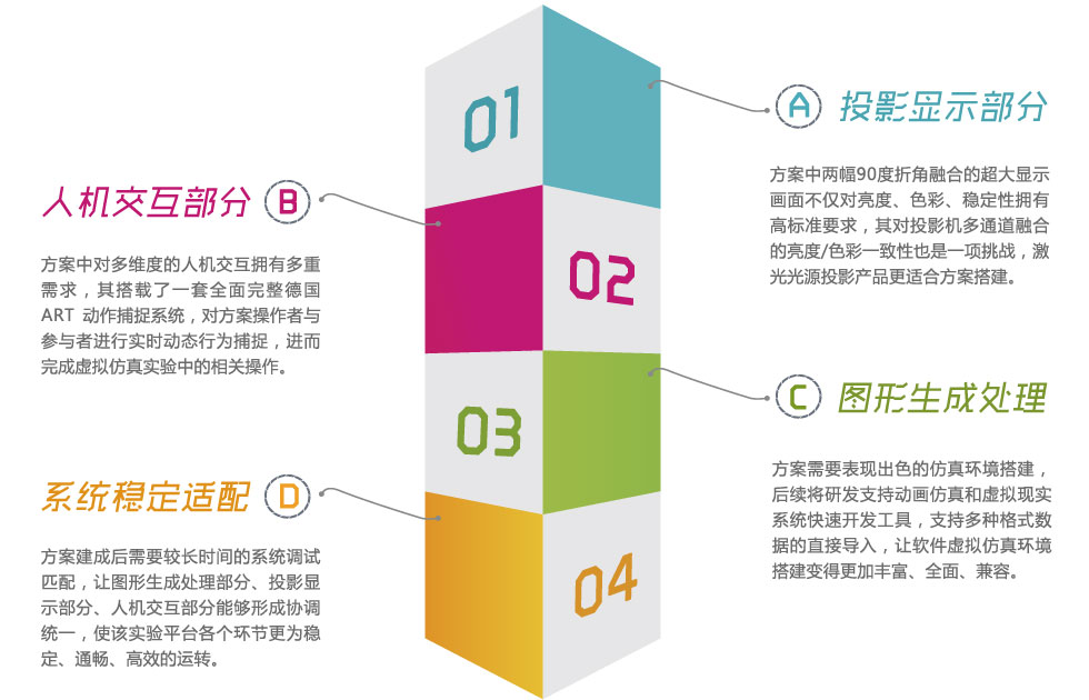 該平臺全面運用了成熟的投影顯示方案,將巨幅投影顯示屏幕作為平臺對外展示的接口,通過逼真、沉浸式、帶入感的畫面將操作者置身于高度仿真的虛擬空間,通過攝像機進行數據收集,進而得到精準全面的用戶行為反饋數據,下面一起認識下系統中涉及的各種技術與產品。 |