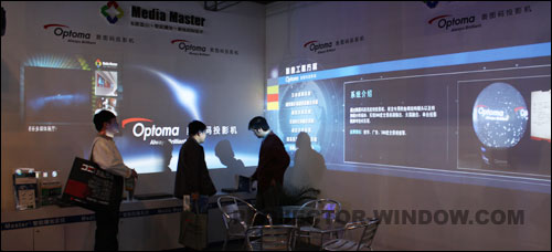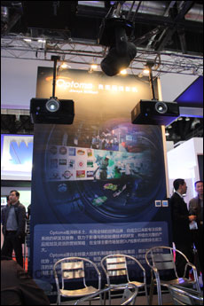 在艾恩光電展臺,由Optoma 2臺3D多功能投影機EX785實現多通道無縫平板立體顯示,將拼接效果發揮極致,展現了最基本、用途較廣泛的一種解決方案模式。展臺最新吸引人的便是多點式觸動沙盤,由Optoma2臺EX785實現終端畫面輸出,觀賞者可在沙盤上實現多點觸控,畫面形象立體,互動參與度高。