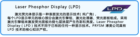 Prysm(溥美)公司總部位于美國加州硅谷,基于其擁有的全部專利激光熒光體顯示(LPD)技術(shù)研發(fā)出新的顯示平臺。LPD這種大尺寸自由顯示平臺能夠以任意尺寸和形狀來支持針對各種商業(yè)市場的顯示拼接墻解決方案。與傳統(tǒng)技術(shù)相比,LPD提供鮮艷、生動逼真且等身大小的顯示,并提供者是融入式體驗,同時具有最低運營陳本且滿足最高環(huán)保標(biāo)準(zhǔn)。大恒創(chuàng)新作為Prysm中國區(qū)總代,勢必與Prysm共同開創(chuàng)激光大屏新時代。 |
