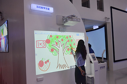 本屆展會期間,針對現代教育,愛普生推出了全新的超短焦投影機CB-595Wi,全新的投影設置,配合手指互動組件,不需額外購買電子白板,便攜易用且高效的技術功能成為萬眾矚目的焦點。
