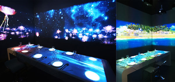 隨著高端工程投影機投入到更多細分領域,展會現場,明基還應用5臺工程投影機,搭建了沉浸式多媒體餐廳解決方案演示區,四周墻面及餐桌上投影美輪美奐的畫面,通過營造不斷變化的場景氛圍帶給顧客沉浸式體驗,邊用餐邊享受視覺藝術盛宴。美食、科技和藝術結合的方式,盡顯高端奢華品味,大大提升了餐廳形象。