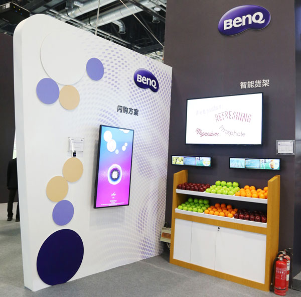 而現場展示的智能貨架方案,則是搭配明基專業貨架顯示器進行超市產品推介宣傳的一種方案。其特有的顯示尺寸及比例更加貼合超市貨架的大小,使其與貨架完美切融為一體。另外搭配明基專業信息發布系統,可以通過網絡遠程將產品宣傳視頻、圖片、廣告信息等內容推送到顯示終端,做到遠程部署及中央控管。同時,明基還展示了閃購方案,它是一款通過品牌甄選促銷產品在店鋪內進行短期促銷,如節日、限時等機會,以手機操作大屏幕上顯示的促銷產品,來獲得折扣、甚至免費線上購買產品,從而增加客戶促銷體驗感的智能產品。