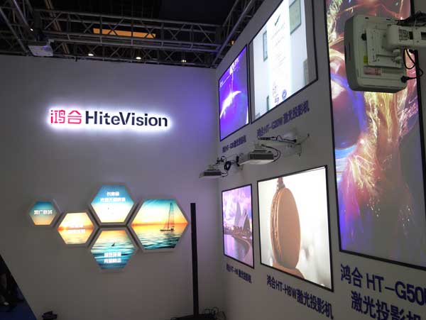 今年的鴻合科技展位無疑是展會中的一道亮麗風景線,無論是極具突破性且充滿科技感的展位設計;還是HiteVision全系列激光投影、鴻合代理的多款NEC工程投影機的集中展示,均讓參觀者眼前一亮。