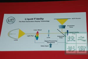 根據(jù)現(xiàn)場(chǎng)的技術(shù)解說(shuō)展板圖示,采用美國(guó)MicroDisplay公司開(kāi)發(fā)的單板LCOS光學(xué)系統(tǒng)“Liquid Fidelity”技術(shù)。