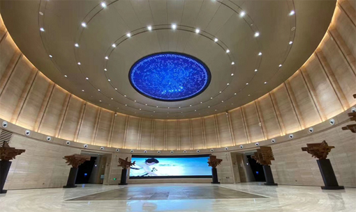 走進序廳,仰頭就能看到圓形天頂中央的《天文圖》,標注天文圖像。這個天文圖正是由艾比森昆侖KL3產品打造的圓形天幕屏,直徑7米。腳下則是銅刻的現存最早、最完整、精度最高的中國全國性地圖——《禹跡圖》。站于其中,仿佛忽然穿越到千百年前的浩瀚宇宙,漫漫星辰,感受到古時人們天圓地方的宇宙探索。讓走入序廳參訪的賓客瞬間回到千年前,為進入古代篇奠定基調,這便是LED顯示屏與建筑創意的完美融合。