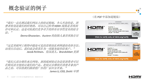 Brad Bramy先生提到,HDMI許可管理公司現(xiàn)在提供了一個(gè)解決方案,通過(guò)HDMI采納者和經(jīng)銷(xiāo)商使用的網(wǎng)站的驗(yàn)證橫幅,讓消費(fèi)者可在購(gòu)買(mǎi)前進(jìn)行網(wǎng)上驗(yàn)證。點(diǎn)擊或掃描橫幅(二維碼)會(huì)連接到HDMI官方網(wǎng)站,來(lái)驗(yàn)證