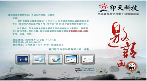 2013年11月2日—4日,第65屆中國教育裝備展示會將在成都市世紀城新國際會展中心隆重舉行,本屆展會,印天科技將攜多款特色產品及互動教育解決方案亮相,三大特色主題展區帶您一同領略印天產品獨特風采。