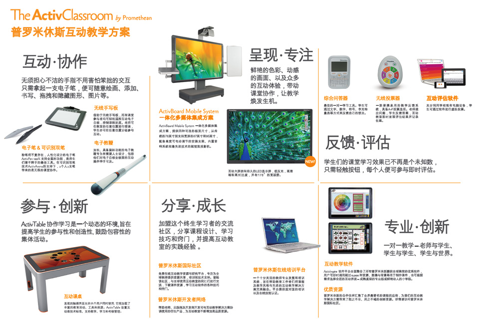 提供多種互動電子白板+短焦投影的組合方案;屢獲全球殊榮的互動教學軟件個人版、專業版及中文資源庫;互動教學評估反饋系統-最有效的過程性評估手段;全球公認的最嚴謹完善的教師專業發展、培訓和認證機制;全球最大的免費在線互動教學資源共享與研究平臺。 |