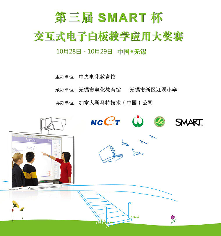 第三屆SMART杯交互式電子白板教學應用大獎賽于2011年10月27日至29日在江蘇省無錫市新區江溪小學舉行,屆時進行優秀課例的現場交流活動并產生兩名特等獎,還將舉行隆重的頒獎儀式。各地方教育部門、電教機構、學校和教師參加本次活動。 |