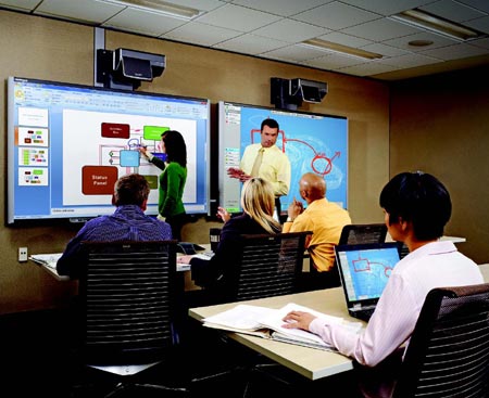 由SMART Technologies公司提供的新會議室解決方案豐富了微軟與其客戶之間的合作方式。之前會議室使用的是普通白板,限制了每次介紹會議內(nèi)容以及工作量。這也成了微軟設計人員與客戶之間溝通的屏障。為解決該問題,可在兩個會議室中各配備一塊交互式電子白板,創(chuàng)建一個多功能白板環(huán)境,滿足更復雜的商議需求。通過這種配置,客戶與微軟團隊成員可在不同的交互式電子白板上操作相同的圖表。他們可通過做批注來表達各自的具體需求。也可從其它途徑引入新的批注或發(fā)布網(wǎng)絡應用程序。