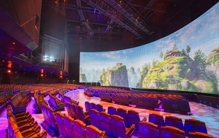 長隆海洋王國5D城堡影院播放大廳內這幅巨型的3D弧形屏幕是最大的3D弧形屏幕,十分吸引眼球。屏幕呈180度橫向鋪開,長88米、高18米,總面積超過1500平方米,是普通四維影院的四倍,由此打破吉尼斯世界紀錄,獲得了“最大的3D立體投影”稱號。