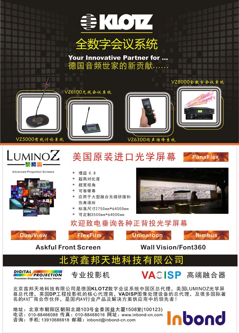 2012年5月24日-27日第二十一屆中國(guó)國(guó)際專業(yè)音響、燈光、樂器及技術(shù)展覽會(huì)(PALM EXPO 2012)在中國(guó)北京國(guó)際展覽中心(新館)即將拉開帷幕,歡迎蒞臨北京鑫邦天地科技有限公司展位,展位號(hào)E2H46,屆時(shí),北京鑫邦天地科技有限公司攜德國(guó)KLOTZ數(shù)字會(huì)議系統(tǒng),美國(guó)LUMINNZO屏幕首次全面亮相!敬請(qǐng)期待!