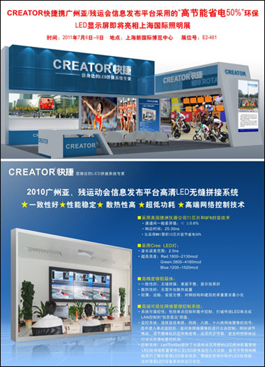 2011年7月6-9日,國內最專業的LED顯示屏無縫拼接系統制造商CREATOR快捷將攜應用于亞運會公共信息發布平臺的“高節能省電50%”環保LED顯示屏系列產品、LED控制應用設備強勢出擊2011年全球最大的LED照明產業盛會——第六屆上海國際照明展。
