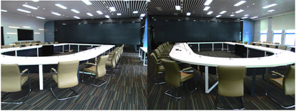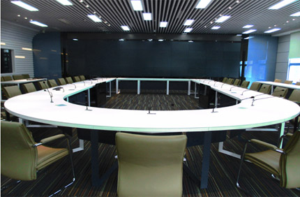 會議室配有:前后的左右共4個攝像機、20個會議發言單元、40個LED屏組成拼接墻、2個高清電視機、多路燈光。