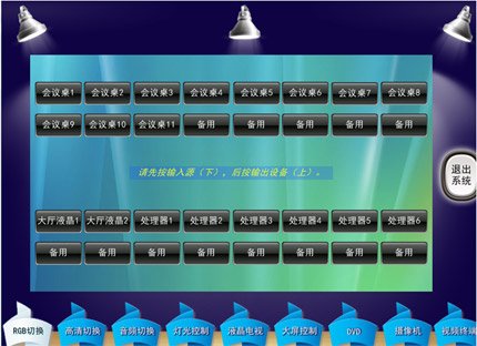中控:控制各種紅種紅外投備。(藍光DVD、高清電視機);通過串口控制LED大屏的模式切換的切換;通過串口控制高清矩陣切換電腦信號、視頻信號到大屏上以及音頻的自由切換到調音臺上;通過串口控制第三方智能燈控控制系統實現會議室及走廊燈光的開關控制和調節燈光控制;通過串口控制視頻會議終端,再加上控制攝像機的會議跟蹤功能實現遠程會議;控制攝像機及會議主機及,實現會議話筒跟攝像機的自動跟蹤。