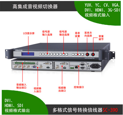 SC-390是一款集YUV、YC、CV、VGA、DVI、HDMI、3G-SDI視頻格式輸入,DVI、HDMI、SDI視頻格式輸出的高集成音視頻切換器,采用了CREATOR獨(dú)特的音視頻切換技術(shù),為滿(mǎn)足當(dāng)今使用顯示設(shè)備的高質(zhì)量、高分辨率視頻的需求而設(shè)計(jì),支持多種輸入輸出分辨率,提供面板按鍵與PC軟件同步操作。