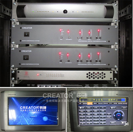 該指揮中心研判室與處警室運用了CREATOR快捷數字化有線會議系統的核心部分——會議系統控制主機CR-M4101及桌面式純發言主席/代表單元CR-CR-M4102/04B,采用32bit高速浮點、DSP處理技術,可配合電話耦合器,可以進行遠程電話會議;配合攝像跟蹤系統(如該會議室安裝的吸頂式球形攝像機)可實現攝像自動跟蹤;提供帶寬20Hz~20KHz完美音質。