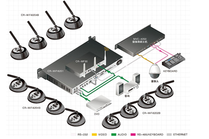 WiFi頻道。由于WiFi信號無方向性傳輸、不受障礙物阻擋、傳輸距離遠等特性,在整體方案的設計上,根據會場的實際使用面積,只需配置一臺無線接入點CR-WF30就可完成整個會場信號的覆蓋。會議主機CR-WiFi6201內置自動攝像跟蹤控制功能,配合攝像跟蹤混合主機CR-MVC4200、高清視頻會議攝像機CR-V1013,可進行全程自動跟蹤拍攝,高度符合廣東省農業廳現代高科技會議要求。