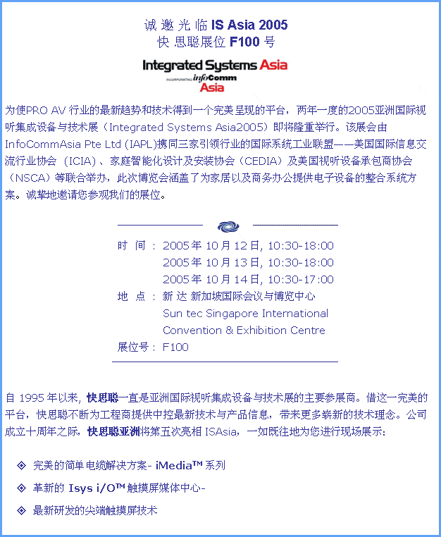 快思聰為世界知名的先進高級控制系統生產商,并提供自動化系統方案。廣泛應用于商業機構的董事會會議室、培訓室、會議室、視像會議、遙距教學中心、娛樂設備及高科技家居。我們的宗旨是 productspluspeople(卓越產品+優質服務+經驗員工)說明了憑借快思聰員工全心全意的工作態度,我們承諾專注于提供最優質的產品、編程及服務.如若查詢更多有關資料,請瀏覽