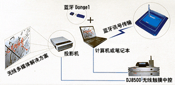 “無線交互式多媒體教室解決方案”是基于藍牙無線技術的多媒體教室解決方案,包括中控系統、投影系統、節目源系統、擴聲系統及輔助系統組成。其中的重大改進是在手寫輸入上采用了藍牙電子白板,通過藍牙技術無線連接,實現無線手寫操作。該方案簡便、簡單、易用性強,向與會嘉賓灌輸了一種全新的“無線交互式”的教學理念。