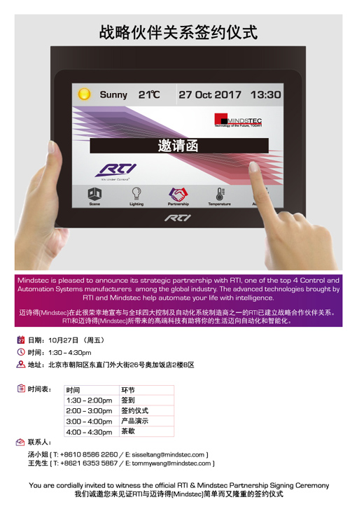“用心合作,共創未來”邁詩得亞洲(Mindstec)與RTI戰略合作發布會,將于10月27日北京奧加飯店2樓B區舉行。在此,我們很榮幸的宣布與全球四大控制及系統制造商之一的RTI建立戰略合作伙伴關系。