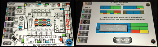 該平板電腦采用圖形平面圖表示和反映音視頻源和分布式電視顯示器的彩色編碼圖標(biāo),包括一個(gè)巨大的18電視視頻墻顯示矩陣(6*3)。
