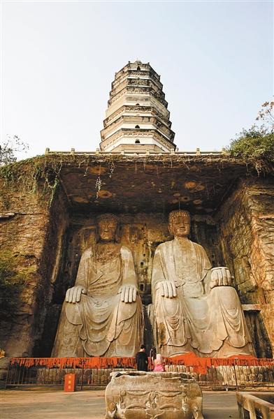 大足石刻位于重慶大足區(qū)境內(nèi),始建于唐朝,共有74處5萬余尊宗教石刻造像。其中以寶頂山和北山摩崖石刻最為著名,其以佛教造像為主,是中國晚期石窟造像藝術(shù)的典范。北山摩崖造像長約三百多米,是全國重點(diǎn)文物保護(hù)單位、世界文化遺產(chǎn)。