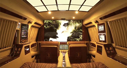 這款被精裝過后的2015款凱迪拉克凱雷德已經一躍成為奢侈品的行列,而究其原因則在于其對后座的大幅改裝。改裝后的這款SUV的后座儼然成為了一個集辦公和休閑為一體的豪華包房。乘客在此既能不受干擾的辦公,同時也能獲得和影院一般的享受,其最吸引人的特點就在于內置了48英寸的大屏4K弧面超高清電視機。此外,車內還搭載了車載衛星天線系統,可連接iPad、Mac