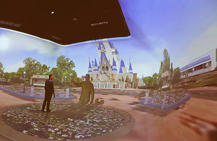 WDI團(tuán)隊(duì)繼續(xù)對(duì)虛擬現(xiàn)實(shí)進(jìn)行思考,但是從不同的角度實(shí)現(xiàn)它。他們沒有讓你在面前放上顯示器,而是開始研究“洞穴”(caves),即使用高分辨率的顯示器包圍你的視野。這種體驗(yàn)的一個(gè)簡化版本在迪士尼的“翱翔加州”(Soarin’