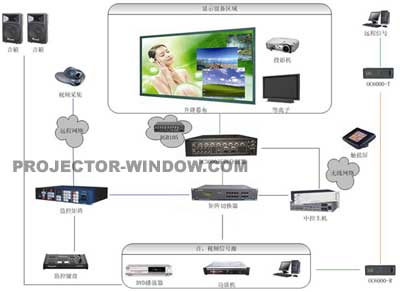 該系統組成設備包括:遠端視頻采集設備、計算機信號輸出設備、DVD播放器、功放機、音響設備;該系統環節主要完成對各種圖文信息(包括各種軟體的使用、DVD/CD碟片、錄像帶、各種實物、聲音)的播放功能;實現多功能廳的現場擴音、播音,配合大屏幕投影系統,提供優良的視聽效果。