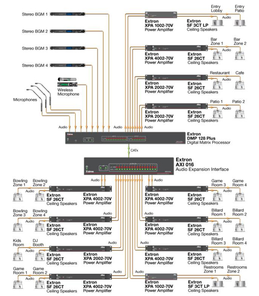 音頻擴展接口可支持集成了 1 臺 DMP 128 Plus 和 1 臺 DTP CrossPoint