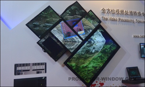 曹經理特別指出,本次展會的重點產品是C3-540,是TV One公司今年推出的新品,并就這款產品的技術亮點做了詳細講解。TV One最新產品C3-540帶3G-SDI/DVI-U接口組合的混合矩陣器/轉換器成為本次展會的亮點。現(xiàn)場六個不同尺寸的屏幕拼接,打造的創(chuàng)意顯示方案,并有兩個小窗口畫面顯示,畫面色彩出色,拼接畫面連貫,適用各種創(chuàng)意顯示應用領域。C3-540采用CORIO3平臺,能提供一個全新概念和高效率的影像處理平臺,構建、整合影像與聲音系統(tǒng);基于TV One獨家的CORIO3技術,使用業(yè)界第一個視頻路由、切換和視頻轉換的CORIO softswitch平臺固件,提供了高質量的視頻矩陣切換模塊;C3-540也提供了也提供了一些列模擬和數(shù)字視頻格式之間的上下交叉轉換,方便用戶選擇所需視頻格式以及輸入輸出數(shù)量的模塊;所有的功能皆可通過RS-232/422/485串行接口,USB或者IP鏈接控制,使用方便;此外,C3-540先進的數(shù)字閃爍消除電路和高采樣頻率(4:4:4),確保圖像的純凈細膩,帶給用戶完美的體驗。這款產品接口豐富,包含16組插槽,采用自主研發(fā)的DVI-U接口,適用市面上顯示終端的輸入,具有信號自動識別能力, 最多支持32路HD-SDI信號等優(yōu)勢特性。TV one C3-540具備高水平的影像處理能力外,它靈活的擴展與整合能力,更是能滿足設計的創(chuàng)意性與動態(tài)影像顯示的嚴格要求。