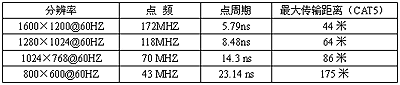 以上計算結果說明,按照RGB錯位時間t不超過0.5倍點周期的要求,使用超五類雙絞線電纜傳輸計算機1024×768@60HZ的信號,最大傳輸距離為108米。表4列出了使用超五類雙絞線電纜,幾種分辨率信號的最大傳輸距離。
