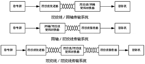 系統中配置一臺雙絞線/同軸矩陣切換器,矩陣的輸入為雙絞線,輸出為VGA或5BNC。所有的信號源均經過發送器轉換為雙絞線,與矩陣連接。該系統要求矩陣切換器與投影機必須共地,矩陣切換器宜與投影機就近安裝。由于信號源與矩陣通過雙絞線連接,因此,信號源的地線不會對系統產生干擾。