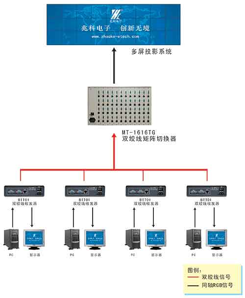 由圖可見(jiàn),該系統(tǒng)由信號(hào)源、雙絞線發(fā)送器、傳輸線、雙絞線矩陣切換器及顯示設(shè)備(投影機(jī))五部分組成。其中的信號(hào)源和顯示設(shè)備與同軸電纜系統(tǒng)完全相同,所不同的是信號(hào)接口、傳輸線、矩陣切換器這三部分。此處的矩陣切換器與顯示設(shè)備安裝在相近的位置,因此在矩陣切換器與顯示設(shè)備之間仍采用同軸電纜傳輸。而信號(hào)源與矩陣切換器之間采用了雙絞線傳輸。在信號(hào)源與雙絞線之間需插入一接口設(shè)備,叫做雙絞線信號(hào)發(fā)送器(BTT-01),其主要功能是將非平衡計(jì)算機(jī)視頻信號(hào)轉(zhuǎn)換為平衡信號(hào),以便與雙絞線匹配連接。同時(shí),雙絞線發(fā)送器還具有可調(diào)線路特性補(bǔ)償功能,以彌補(bǔ)長(zhǎng)傳輸線對(duì)信號(hào)造成的損失,提高圖象的清晰度。BTT-01發(fā)送器的輸入為VGA,與計(jì)算機(jī)顯卡連接,輸出為RJ45,與雙絞線連接,此外還有一個(gè)本地監(jiān)視輸出,接計(jì)算機(jī)顯示器。傳輸線是使用的非屏蔽(UTP)超五類(lèi)(CAT5)網(wǎng)線,此種網(wǎng)線是目前網(wǎng)絡(luò)布線使用最多的,價(jià)格較低。但市場(chǎng)上的超五類(lèi)網(wǎng)線品牌繁多,質(zhì)量差異也很大,在采購(gòu)時(shí)應(yīng)注意選擇品牌質(zhì)量皆?xún)?yōu)的產(chǎn)品。對(duì)屏蔽(STP)超五類(lèi)網(wǎng)線,其屏蔽空間電磁輻射干擾的能力要優(yōu)于非屏蔽超五類(lèi)網(wǎng)線,在環(huán)境電磁干擾較大,要求高的場(chǎng)合,可考慮使用。系統(tǒng)中使用了一臺(tái)矩陣切換器作為信號(hào)交換中心。但此處的矩陣切換器與通常的矩陣切換器有所不同,是一種雙絞線矩陣切換器,其輸入為RJ45接口,可與雙絞線直接匹配連接,輸出為VGA接口,可通過(guò)RGB信號(hào)電纜直接與顯示設(shè)備連接。