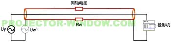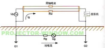 地線干擾是顯示系統經常出現的干擾,工程中出現的干擾大多屬于此類干擾。產生地線干擾的原因,是由于系統中存在兩個以上相互沖突的地線。圖一表示了來年各個電線產生干擾的原理,圖二是等效圖。圖一中存在兩個地線,G1是信號源的地線,G2是顯示設備(投影機)的地線。這兩個地線間存在地電阻Rg。大地作為各種設備的公共回路,存在地電流。地電流在地電阻Rg上產生的電壓降Ug。Ug產生的電流Ig流過電纜外導體。由于電纜外導體也存在電阻Rw,Ig在Rw上產生電壓降Uw,此電壓既為干擾電壓。Uw與信號源電壓Uy疊加(見圖二),形成對圖象的干擾。地電流的主要成分是50赫交流電及電器設備產生的干擾脈沖,在圖象上的表現是水平黑色條紋,參雜有水平雜波,且沿垂直方向緩慢移動。