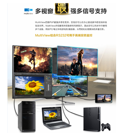 為充分發揮40英寸超大尺寸以及超級豐富接口的優勢,極清4K BDM4065UC搭載了飛利浦MultiView多視窗技術,可實現雙路信號PiP(畫中畫)或4路信號PbP(畫外畫)顯示,結合RS232更可用于安防監控。同時,借助飛利浦SmartControl