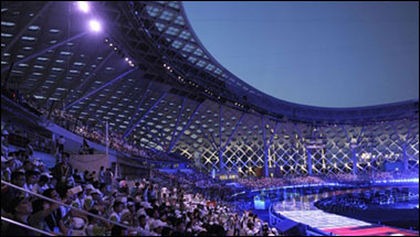 開(kāi)幕式上獨(dú)特的“世界之門(mén)”,面積近3000平方米,由365塊LED組成的可以開(kāi)閉的LED幕墻,寬約110米,高約26米。