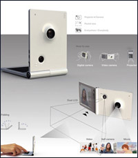 [投影之窗消息] Yanko每年都會強調推出其年度最受歡迎的設計。今年,“The Eye”成為其熱推的投影攝像機概念。“The Eye”包括投影機、照相機,和攝像機。此款產品可像書本一樣折疊,并配有雙LCD屏幕。投影機被固定在照相機鏡頭右側。目前此產品的性能、規格暫時還沒有公布。