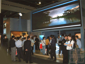 此系統(tǒng)在屏幕邊緣處1mm的小孔中穿入細(xì)線接縫,使得每張屏幕能被巧妙地結(jié)合在一起,屏幕的物理拼縫為零,光學(xué)圖象間隙僅為2mm。接縫后方的遮光板避免了投影機(jī)投出的光線映在相鄰的屏幕上。屏幕固定于框架的頂部,這樣即使當(dāng)溫度和濕度發(fā)生變化時(shí),屏幕也可以得到伸展而不會(huì)彎曲。
