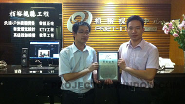 EliteScreen億立屏幕華南區業務代表周海(左)與廣州栢裕郭經理(右)合影 |