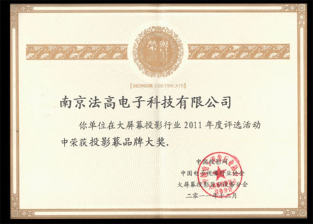 值得關(guān)注的是,南京法高電子科技有限公司歷經(jīng)重重“難關(guān)”,最終一枝獨(dú)秀獲得一致認(rèn)可,一舉奪得“2011年度投影幕品牌大獎(jiǎng)”,最具含金量的大獎(jiǎng)!