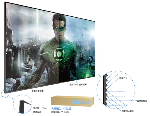 溢彩DY3 抗環境光屏幕的表面精細鏤刻齒型光柵,僅對特定角度的投影機入射光束進行靶向反射,非成像角度的環境光則被齒型光柵另側的吸光涂層悉數吸收,且不發生衍射,即使在白天,無需拉窗簾,無需關燈,依然呈現色彩飽和、層次豐富的投影畫面。