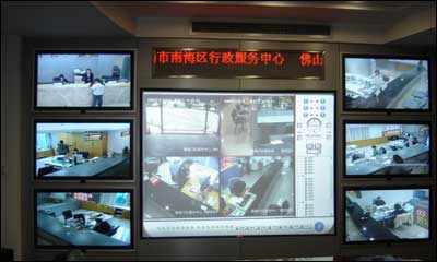 以上案例照片為佛山市南海區行政服務中心的監控系統終端實拍照片,中間主屏幕采用摩科™MD 103高亮度投影屏,兩側各配以三臺液晶顯示器,對服務中心內的各辦公區域實行多角度全方位的實時監控。