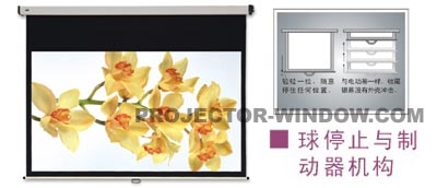 球停止裝置&制動器機構是OS公司專利技術,銀幕輕輕一拉就能停止,拉升到最大限度時也能解除鎖定。收起時勻速上升,能將對布料的損傷降到最小,收藏銀幕時沒有外殼沖擊。