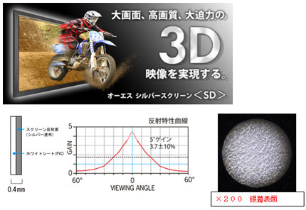 近日、OSSCREEN新開發了3D專用優質銀色布料(SD201)。這款新的銀色布料的影像失真率=0.4%,這一數值達到了前所未有的水平。另外、此布料如果戴上眼鏡也不會降低亮度、增益能達到3.6度。(另外、因為使用獨特的背面涂層技術,即使再高增益的情況下也不會讓人感覺到太刺眼)※所謂的影像失真是在播放右眼映像時所投射出左眼映像的映射率。