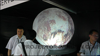 展會上,神州服聯展示的大型球形顯示系統,吸引了眾多觀眾。大型數字球形顯示系統是直徑為3米到25米的一種球形的數字化的宣傳展示系統,本系統由專用大角度球幕鏡頭、特殊的大尺寸球幕、高流明投影機、專用融合系統輔助設備組成。