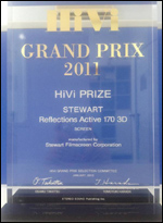 旗下Reflections Active 170 3D屏幕材料獲得日本著名家庭影院雜志Hivi雜志授予的2011年度最佳輔助設(shè)備大獎(jiǎng)。這項(xiàng)大獎(jiǎng)由行業(yè)人士投票選出,旨在獎(jiǎng)勵(lì)當(dāng)年推出的優(yōu)秀新款產(chǎn)品,這已經(jīng)是Stewart公司屏幕產(chǎn)品材料第二次獲得其頒發(fā)的獎(jiǎng)項(xiàng),也再一次證實(shí)了Stewart