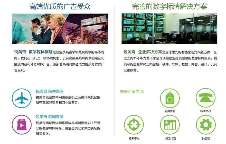 銳美奇是全球領先的智能數據可視化解決方案提供商,在專業視聽行業已經擁有30余年的經驗,為全球500強中超過70%的用戶提供包括軟件、硬件、服務在內的完整解決方案,是業界公認的數字標牌行業領軍者。銳美奇于今年進入中國市場,為高端用戶提供完善的數字標牌一條路服務,通過數據提取分析和呈現、增值現有系統、視覺體驗與量身定制等多項服務來滿足各行各業用戶的不同需求,除了為用戶提供傳統的數字標牌顯示服務之外,銳美奇在內容制作與視覺呈現上的優勢使其能夠在競爭激烈的數字標牌市場脫穎而出。