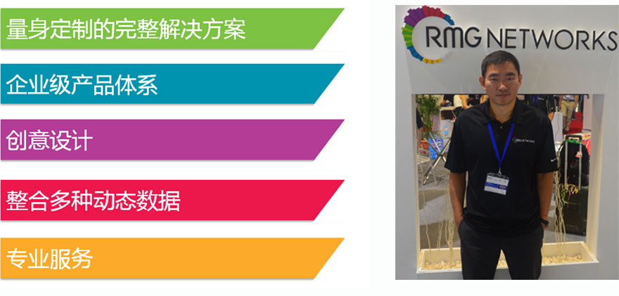 [投影之窗消息]   銳美奇(RMG)是全球領先的智能化視覺解決方案提供商,憑借其數字媒體網絡幫助廣告客戶贏得高端消費者的目光,同時通過其視覺解決方案幫助企業客戶提高自身的競爭力,通過提供先進的技術、優質的服務以及數字媒體網絡,銳美奇將為數字標牌行業帶來更多的商業價值。在剛剛結束的上海數字標牌展上,銳美奇以信息抓取與處理、內容傳輸與呈現相結合這樣的方式為用戶展現出未來數字標牌行業的新動向。